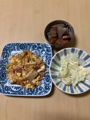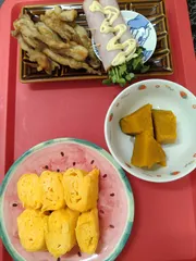 マヨネーズで漬けて揚げたマヨ鶏、ハムのカイワレ巻き、かぼちゃの煮物、玉子焼きを作りました🍳マヨネーズづくしの夜ご飯に大満足です(*^^*)