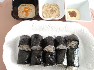 もやしののりまき 茹でたもやしを水分をしっかり切りのりで巻いてカット マヨソースマヨ・ポン酢・ラー油マヨ・しょうゆ・ごまマヨ・梅肉それぞれのソースで美味しく頂きました
