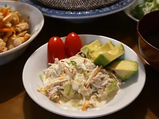 ツナ入りコールスローサラダアボカド添え。マヨたっぷりにツナ缶、米酢、塩、コショウ、ライスシロップ、昆布醤油少々混ぜて完成。