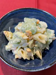 久しぶりに"ペンネサラダ🥗"作りました。🥒+🧅+茹で🥚+🟥キャップマヨフレンチドレッシングを少し…おいしくできました😋