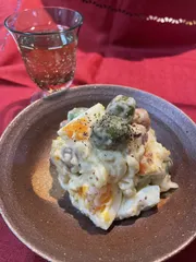 "お酒のあての ポテト🥔🥗"🥔を湯がきゴロっとつぶし生の🧅のスライス多めゆで卵🥚オリーブ🫒ベーコンの代わりに炒めウインナーさっくりキユーピーの🫙マヨネーズであえました。粒マスタード,塩、胡椒で仕上げました♪白ワインでいただきました😋
