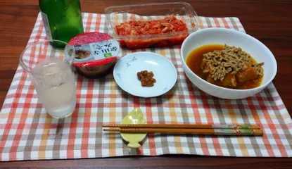 「今日のおうちごはん」ならず「今日の晩酌」です。・マヨネーズとは関係ありません。・画像にアルコールが含まれていますので、お酒に弱い方は閲覧にご注意下さい。⚠️ 手巻き焼肉の前に、ちょっと一杯。なお、焼肉に日本酒は合うんです。👍️ ・南京そぼろ煮(昨日の残り)・キムチ ・金山寺味噌