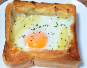 マヨたまチーズトースト いつもはマヨネーズで土手を作るんですが、今回は食パンを1本買ったので厚めにスライス。中をくり抜き、とろけるチーズを入れたあとに卵とマヨネーズを入れてみました😁