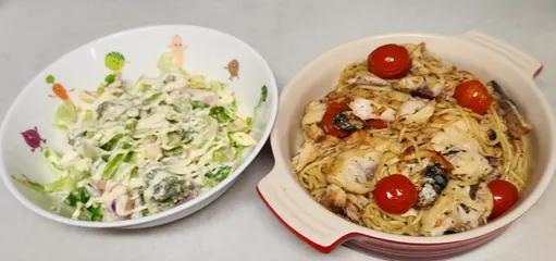 塩鯖のパスタとシーザーサラダ マヨソテーのにんにくと塩鯖とミニトマトにレンチンのパスタを入れて炒め、味付けは、キユーピーさんのレモンドレッシング少々とテイスティドレッシングのトマト&ガーリックとめんつゆで、粗びきブラックペッパーと乾燥パセリのトッピング、サラダはサラダクラブのパッケージサラダのカットレタスに、レンチンのブ
