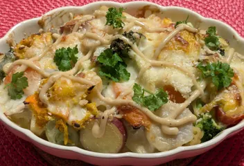 野菜グラタン♪ 今日は1日中ひんやりとした1日でした。身体の冷えを感じたので、野菜グラタンを作りました。今夜は私だけの夕食です😊 『たまねぎ』『にんじん』『さつまいも』『里芋』『れんこん』『ごぼう』『白ねぎ』『大根』『ブロッコリー』『パセリ』『ミニトマト』『マカロニ 7個』『牛乳』『米粉』『とろけるスライ