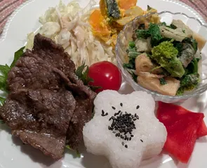 『胡桃とアーモンドドレッシングのキャベツサラダ』『かぼちゃサラダ』『菜の花と白ねぎと油揚げのきなこマヨ和え』『牛もも焼肉 青じそ』『トマトベリー』『ご飯 黒ごま』『赤かぶの甘酢漬け』