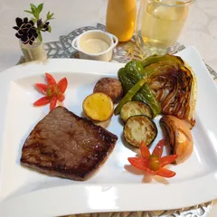 野菜の日の晩ごはん😋 8月31日は、野菜の日✨と、言う事で蒸し焼き野菜タップリのステーキプレートを作りました😋 焼き野菜は、マヨネーズ+ポン酢と甘辛スイートチリ味で味変を楽しみました😋💓