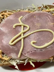 全粒粉食パンをカリッとトーストして刻みキャベツにシラチャー味の辛いマヨをかけてハムをのせる上には普通のマヨで「わ」を書きました
