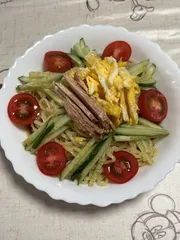 冷やし中華 今年の夏は暑すぎる🥵〜またまたお昼に冷やし中華を作りました。薄焼き卵には定番マヨ❣️ハムを焼豚に変え盛り付けも少し変えてミニトマトでぐるりと囲んでみました😁