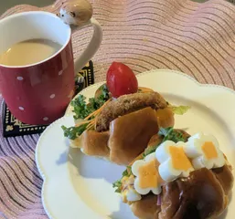 昼食です♪ サラダクラブさんの【ケールが入った7品目の緑黄色野菜のサラダ】を自家栽培巨峰酵母のバターロールにはさんでロールサンドを作りました。 『マヨネーズ衣のヒレカツサンド』『坊っちゃんかぼちゃサラダサンド』