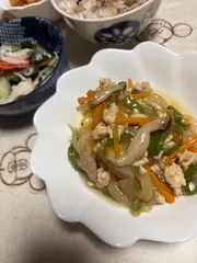 鶏挽肉🐔、玉ねぎ🧅、人参🥕、ピーマン🫑、しめじをマヨで炒め中華味のあんを作りお豆腐の野菜あんかけを作りました。春夏秋冬いつでもいけます😁👍