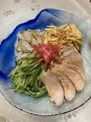 今日のランチの「冷やし中華」です。錦糸卵の卵液にマヨを混ぜました。鶏肉は胸肉にマヨを塗り、弱火でじっくり蒸し焼きにしました。おかげでしっとり出来上がりました。
