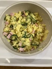 レンチンしてなめらかになるまで潰したじゃがいもに塩揉みしたきゅうりとハムを入れました!シンプルな材料でしたが、美味しかったです♪