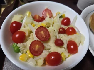 具沢山のポテサラです。馬鈴薯、人参、きゅうり、カニカマ、お魚ソーセージマヨネーズで味付けですトッピングはトマトにしました(馬鈴薯は粗く潰しました)。