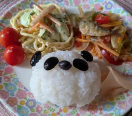 昼食♪ 今日のお昼は、昨日の残り物です😊 『鯵の南蛮漬け』『スパゲティサラダ』『トマトベリー』『パンダご飯』『新生姜の甘酢漬け』