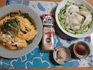 公式レシピ「水餃子 麻辣マヨ」水餃子は市販品です…m(__)mピリッと麻辣が合います♡ ニラ玉は某孤独系グルメドラマの再現レシピを参考にしました豚バラの下味と卵にマヨを使っています卵、破れちゃいました( ̄▽ ̄;)