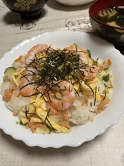 夕飯にちらし寿司 夏バテ気味なのかあまりこってりしたものを受け付けなくなってます。なので、ちらし寿司にしてみました。錦糸卵にマヨを入れてフンワリと🥰