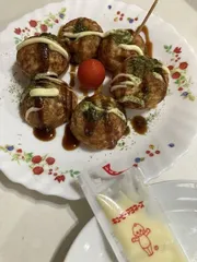 冷凍のたこ焼き、小袋のマヨを使いました🥰たこ焼きがポンテリングに見える?チョコとホワイトソースに見える・