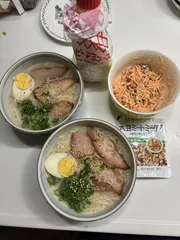 博多長浜とんこつらーめん お土産で買った半生タイプ細麺博多とんこつラーメンを作りましたミックさんのニンジン🥕サラダで塩胡椒、酢を少しマヨを入れ過ぎちゃってオレンジ色がない。でも美味しい買ったです。