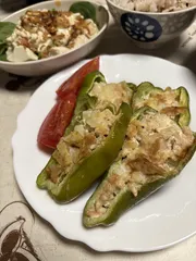 ピーマンのシーチキン詰め ピーマン🫑のシーチキン詰めを作りました。シーチキンと玉ねぎをマヨで和えて詰めて焼き色をつけました。あっさり頂けます。豆腐のサラダにはフライドオニオンとキユーピー黒酢玉ねぎドレッシングをかけました。このドレッシング好きなんです❤️