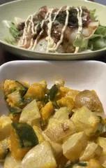 昨晩のごはん キャベツ巻きと南瓜じゃがいもの味噌マヨ和えです。