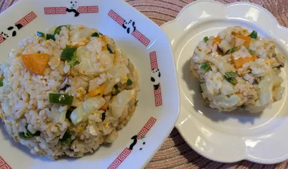 今日の昼食はチャーハンにしました🧑🍳『白ゴーヤ』『にんじん』『しいたけ』『ピーマン』『白すりごま』『たまご』『マヨネーズ』『中華顆粒スープ』『お醤油』『焼肉のたれ』『黒酢』『ごま油』