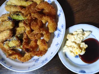 エビフライ、茄子フライにタルタルソース瓶マヨネーズを使いました😄