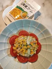 コールスローサラダ🥗作りました♪キャベツ、新玉葱🧅、人参🥕、胡瓜🥒…そして✨キユーピーサラダクラブの北海道コーン🌽♪器の色にコールスローが同化してしまいそうで、急遽周りにトマト🍅を並べたら…先日の黄色いひまわりさん🌻の冷やし中華の盛り付けに印象が似てしまったの💦🙇ゴメンナサ-イ!