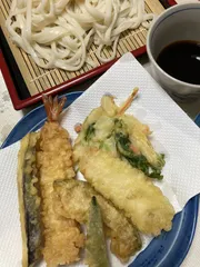 うどんと天ぷら 今日のランチは、お気に入りのうどん(乾麺)と天ぷらです。 衣にマヨを加えてかカラッと揚がりました。