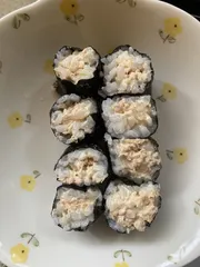 お疲れさまです~(^。^;) すし飯が面倒ですか? マヨネーズで酢飯風作れますが、ツナマヨにもマヨで、マヨ×マヨになっちゃうか…笑 海苔はおにぎり海苔使うと巻きやすいですよね!横幅が短いと巻きす要らない☆ アイコン、息子ちゃんが描いてくれたの?可愛い~♡ 頑張ってくださいね!