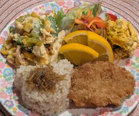 【10品目のサラダ レタスやパプリカ】【かぼちゃサラダ】【ゴーヤとハムとサラダクラブ 北海道コーンのたまご炒め(黒酢たまねぎ+マヨネーズ)】【マヨヒレカツ】【玄米ご飯(ちりめん山椒)】【オレンジ】