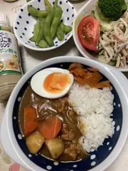 昨日の夕飯です。カレーの具材を炒める時にマヨを使い、ごぼうサラダは深煎りごまドレッシング・薬味ポン酢味で和えました。