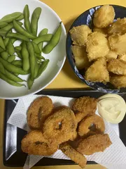 イカリングにマヨ🌟 数日前のごはんでごめんなさい😁💦皆さんご心配をおかけしました🌟どうにか今は回復しつつあります🌻明日は、定期検診‥一年ぶりだから少しドキドキですが。小さいヒーローがついて来てくれるそうです☺️ 数日前ですが、イカリング揚げました😄じゃがいも🥔煮っ転がしに枝豆🫛 さて!いざ‼️今日は