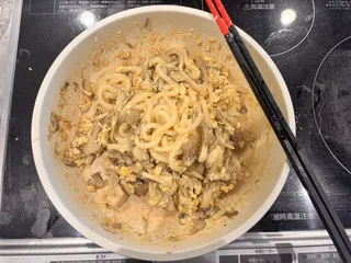 舞茸と卵の焼きうどん いっそかに見た卵と舞茸の炒め物のアレンジです。マヨネーズで卵がふわふわで美味しかったです。