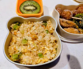 お弁当のご飯 えびたまごチャーハン☺️炒め油代わりのマヨネーズはBBQ味を使ってスモーキーな感じにしてみました✨