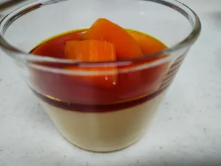 マヨネーズで!なめらかプリンを作りました キユーミーさんで購入したフルーティー フローズン ベジタブル にんじんをトッピングしました