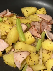じゃがいもをレンチンしてからフライパンにマヨネーズを入れて、ベーコン・じゃがいも・アスパラ・玉ねぎを炒め塩・こしょう・粒マスタードで味付けしました。じゃがいもがカリカリに焼けて美味しかったです😊