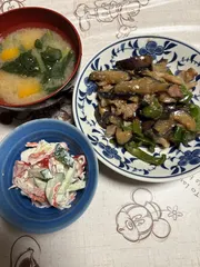 豚肉の味噌炒め 豚肉となす🍆ピーマン🫑で味噌炒めを作りました。食材はマヨソテーして自家製味噌ダレをかけて仕上げました。付け合わせはきゅうり🥒トマト🍅カニカマをマヨで和えてサラダにしました。
