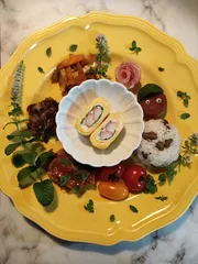 とっても素敵なワンプレートですね。 マヨ卵焼きとてもきれい。☺️👍 いろんなおかずがいっぱいで美味しそう。 むかごのおにぎり🍙とっても美味しそう。 黄色のお皿も素敵。😍🫶