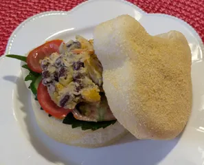 さくらんぼ酵母のイングリッシュマフィンサンド♪ あんこ✕マヨが気になって、小豆を炊いて『じゃがいも』『かぼちゃ』『にんじん』『たまねぎ』と混ぜてサラダを作りました。 それを、今朝から作ったイングリッシュマフィンにサンドしてみした。 『イングリッシュマフィン』『キユーピータルタルソース』『青紫蘇』『フルーツトマト』『小豆サラダ』