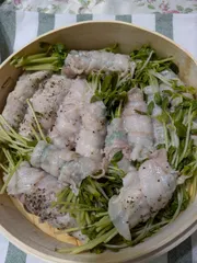 せいろ蒸し器でお肉と豆苗巻きや野菜を蒸して頂きました。マヨ+深煎りごまドレッシング薬味ポン酢味しびれ麻辣味ポン酢+マヨいろいろなお味のマヨを作って美味しく頂きました。