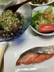 鮭の塩焼きとレンチン茄子 今日の夕飯です。レンチン茄子の調味液にマヨを加えました。