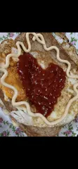 ランチ フライパンにオリーブオイルを引き卵を落とし入れ半熟ぐらいの時に食パンを乗せカラシマヨネーズを塗ってハムとスライスチーズを乗せさらに食パンを乗せひっくり返しますこんがりしたら、さらに盛り付けハートケチャップと燻製マヨネーズをトッピング!