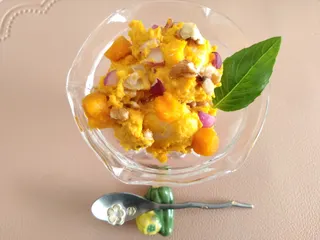 白玉をいつもよりもお豆腐を多めに入れて茹で冷水に入れ 南瓜はさいのめ切りしペーストにしたものにマヨネーズと塩コショウ、みじん切りした紫たまねぎ、 乾煎りした胡桃をあわせ白玉と絡めて完成です トッピングにさいのめ切りのかぼちゃと家庭菜園のバジルを添えました 白玉