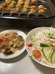たこ焼きと野菜サラダ作りました。たこ焼きいつもより少し大きく焼きましたお口直しにサラダも作りました!