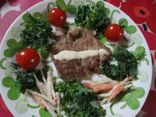 優しいお隣さんが、ケールとポークをくださいました。マヨソテーしたポークソテーには、塩コショウ。ソースは、ハーフマヨネーズ+わさび+お醬油。 おいしかったです~(^^♪ ポム🍀