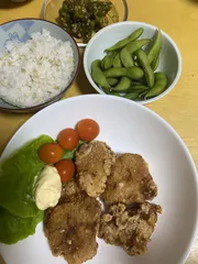 から揚げにゃ〜やっぱりマヨ❣️ まだ、喉な違和感と夜中の咳込みで寝られず。。目は少しよくなった様な🤓とりあえず身体は動くので料理は楽かな🌟下味つけたモモ肉引っ張り出してから揚げに☺️味が染みて美味しく簡単❤️カロリー気にせず!マヨつけたら飛び上がるほどうまー🤗旨すぎだよねー😁ししとうが爆なりで、味噌で作る佃煮と言う物も作りました。