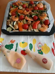 ぎゅうぎゅう焼きに世界のマヨ甘辛スイートチリ味と濃厚BBQソース味をつけていただきました(^O^) ぎゅうぎゅう焼きの具材小粒じゃがいも たまねぎ ズッキーニ パプリカ ミニトマト アスパラガス エリンギ にんにく えび 鶏つくね スイートチリ味はえびや鶏つくね、ズッキーニと相性