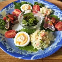 ワンプレートの昼ごはん☀️🍴キユーピーマヨネーズを使ったポテトサラダに、からしマヨネーズをのせた茹で卵、あとは、鰹のたたきにトマトのサルサと、胡瓜とワカメの酢のものでした♪