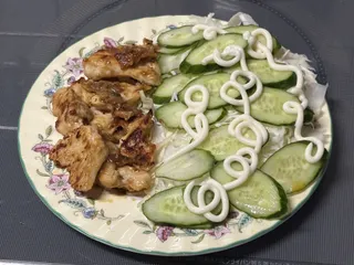 鶏胸肉のピリ辛マヨ(梅入り)焼き鶏胸肉に特製ソース(マヨ➕梅肉➕豆板醤➕酒粕➕味醂大1➕昆布醤油大0.5)漬けて焼いただけ
